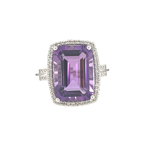 14kt white gold amethyst and diamond ring containing a 14x10mm emerald cut amethyst center gemstone weighing approximately 5.75ct, also containing 54 round accent diamonds having a combined total weight of approximately .22ctw, clarity grade approximately SI3, color grade approximately G-H.