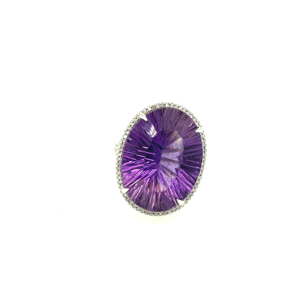 14kt white gold amethyst and diamond ring containing a fancy oval cut amethyst gemstone measuring approximately 21x15mm and weighing approximately 17.57ct, also containing 102 round accent diamonds having a combined total weight of approximately .31ctw, clarity grade approximately SI3, color grade approximately G-H.