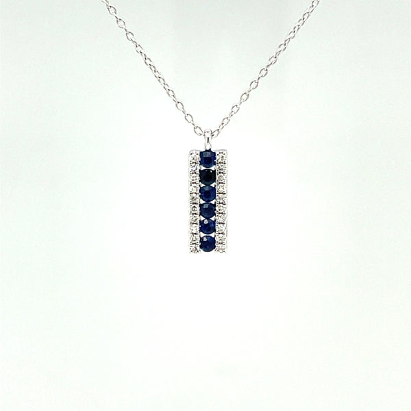 14kt white gold blue sapphire and diamond necklace containing 6 round 1.75mm blue sapphire gemstones also containing 20 round diamonds having a combined total weight of approximately .10ctw, clarity grade approximately VS2, color grade approximately G, on a 14kt white gold 18in chain.