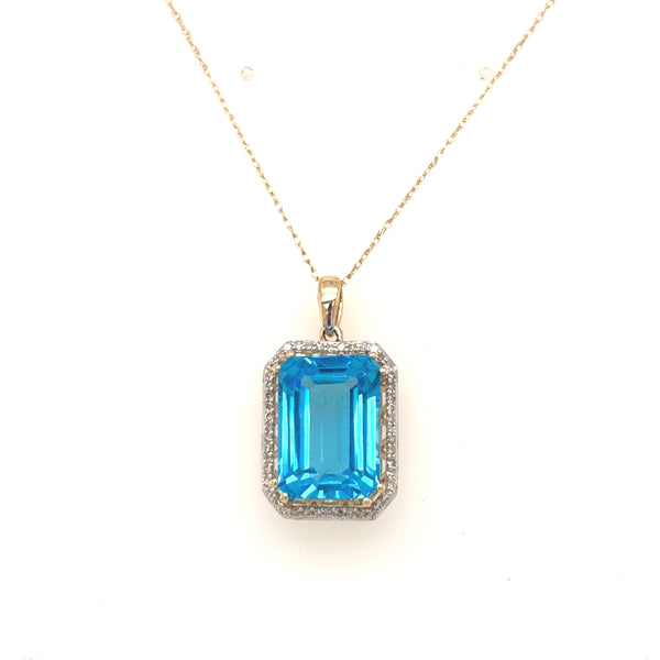14kt yellow gold blue topaz and diamond pendant containing an approximately 14x10mm emerald cut blue topaz center gemstone with 48 round diamonds having a combined total weight of approximately .20ctw, clarity grade approximately SI1, color grade approximately G-H, on an 18in 14kt yellow gold chain.