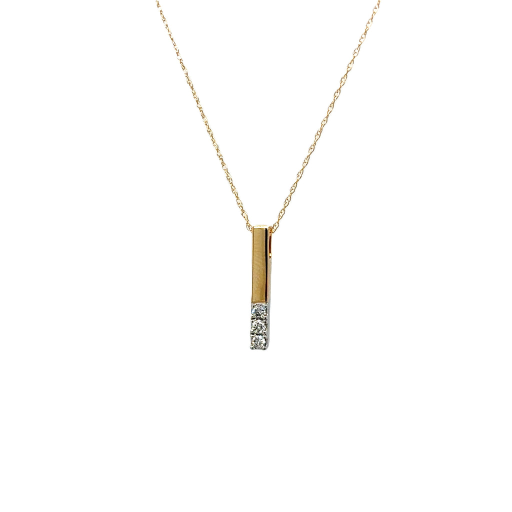 < Back To Anniversary Gifts Diamond Bar Style Pendant Necklace 10kt white and yellow gold bar style pendant containing 3 round diamonds, total approximately .10ctw clarity SI1, color G-H on an 18in yellow gold cable chain. SKU: DP0260 Default Title - $ 510.00 USD Suggested Retail Price: $1,380.02 Klass Jewelers Price! $510.00 Add To Shopping Bag Share:
