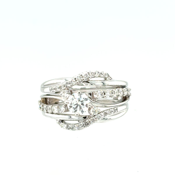 14kt white gold engagement ring set total approximately 1.ctw with wrap-band containing one round center diamond approximately .45ct, two accent diamonds approximately .03ct each, and 34 smaller accent diamonds in surrounding engagement band and wrap-band. Diamonds quality approximately SI2, color approximately H.