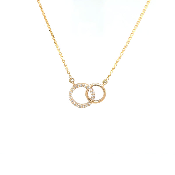 14kt yellow gold double circle diamond pendant containing 20 round diamonds having a combined total weight of approximately .18ctw, clarity grade approximately VS2, color grade approximately G, attached to a 14kt yellow gold 18in diamond cut cable link chain.
