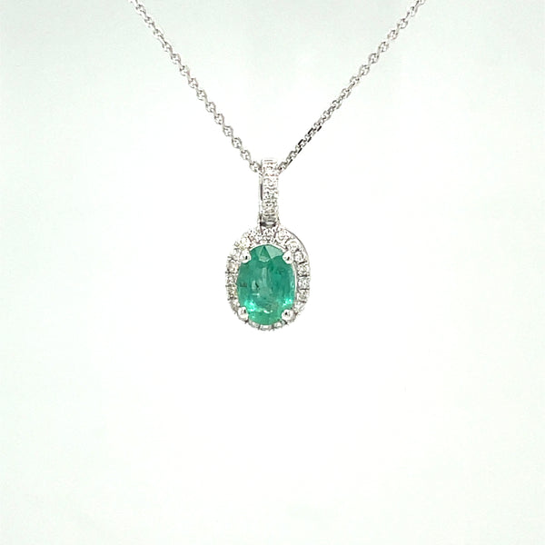 14kt white gold emerald and diamond halo style pendant containing a 7x5mm oval emerald center gemstone with 25 round accent diamonds having a combined total weight of approximately .14ctw, clarity grade approximately VS2, color grade approximately G, chain sold separately.