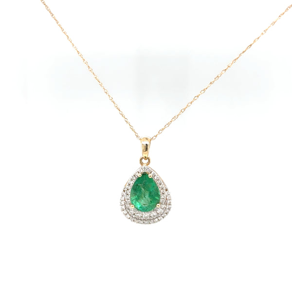 14kt yellow gold emerald and diamond pendant containing a pear shaped emerald gemstone measuring approximately 9x7mm and weighing approximately 1.47ct, also containing 50 round diamonds having a combined total weight of approximately .30ctw, clarity grade approximately SI1, color grade approximately G-H, on an 14kt yellow gold 18in chain.