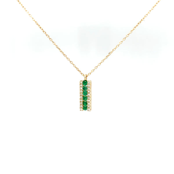 14kt yellow gold emerald and diamond pendant containing 6 round approximately 1.75mm emerald gemstones, also containing 20 round diamonds having a combined total weight of approximately .10ctw, clarity grade approximately SI1, color grade approximately G, on an 18in 14kt yellow gold chain.