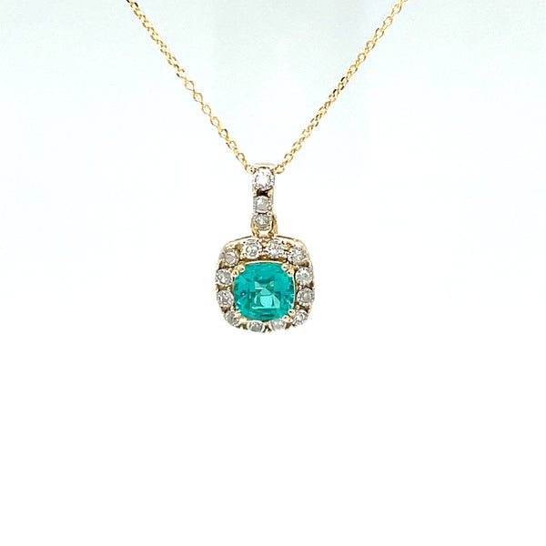 14kt yellow gold green tourmaline and diamond pendant containing a cushion cut .85ct green tourmaline center gemstone with 15 round accent diamonds having a combined total weight of approximately .10ctw, clarity grade approximately SI1, color grade approximately G-H, on a 18in 14kt yellow gold adjustable chain.