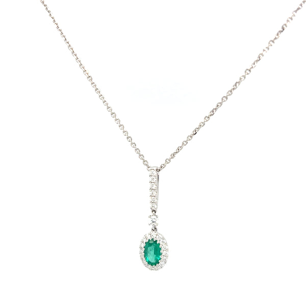 18kt white gold pendant containing a single oval shaped emerald approximately .40ctw, with surrounding halo of 16 round diamonds and 7 accent diamonds on the bail, diamond total approximately .23ctw, clarity approximately VS1, color approximately F-G.