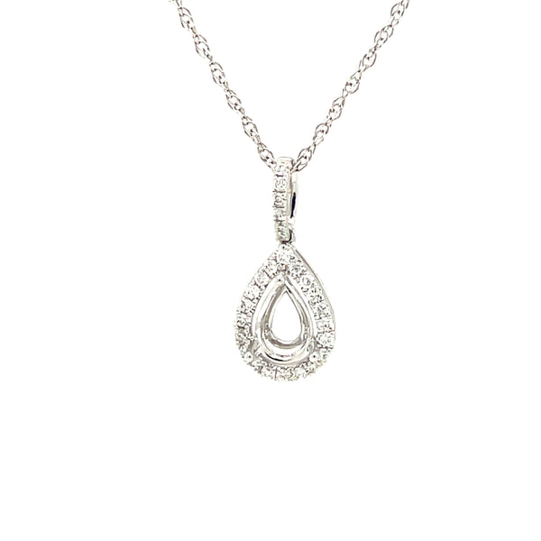 14kt white gold pear shaped diamond halo style pendant semi-mount containing 26 round diamonds equaling approximately .17ctw, clarity grade approximately VS2, color grade approximately G-H. Center stone sold separately, mounting is made to hold an approximately 1ct stone, chain sold separately.