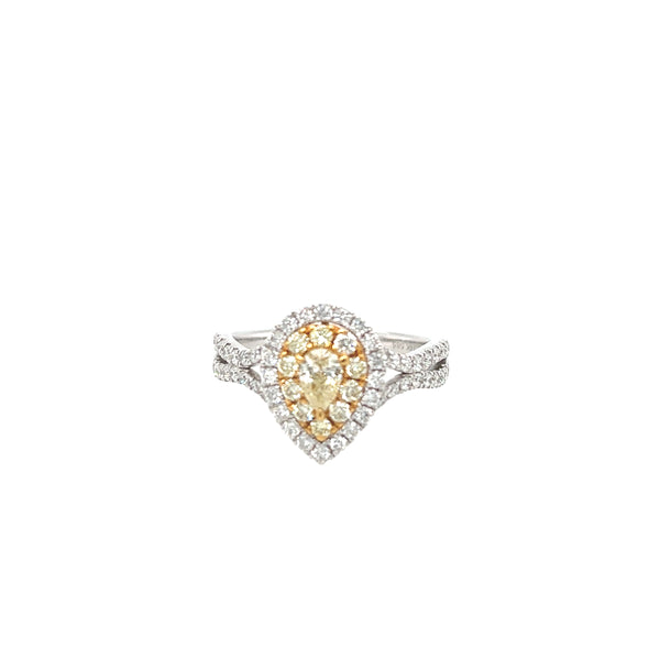 14kt white gold yellow and white diamond ring containing a pear shaped yellow diamond weighing approximately .25ct, also containing 10 round yellow diamonds weighing approximately .23ctw, and 52 round white diamonds weighing approximately .52ctw, clarity grade on all diamonds approximately SI1, color grade on white diamonds approximately G.