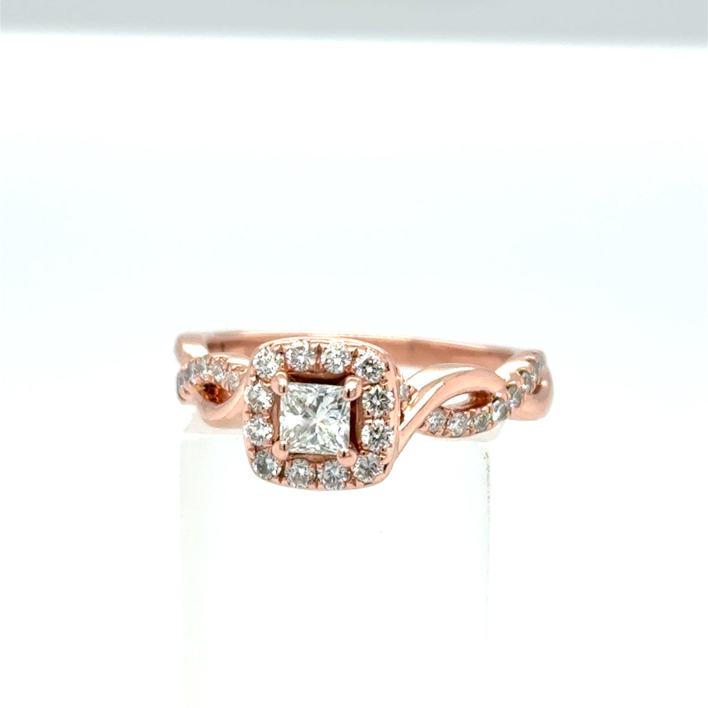 < Back To Anniversary Gifts Rose Gold Diamond Engagement Ring 14kt rose gold diamond engagement ring containing certified .29ct princess cut center stone (#555858000213) quality SI1, color G, with surrounding diamond halo and diamond accented band totaling .75ctw. SKU: EO0112 Default Title - $ 2,175.00 USD Suggested Retail Price: $5,512.08 Klass Jewelers Price! $2,175.00 Add To Shopping Bag Share: