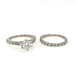 14kt White gold wedding set. One engagement ring containing one round center stone approximately .65ctw, quality approximately SI2 color approximately I with 10 diamonds on ring band total approximately .15ctw, quality approximately SI1, color approximately H. One wedding band containing 15 diamonds total approximately .25ctw, quality approximately SI1, color approximately H.