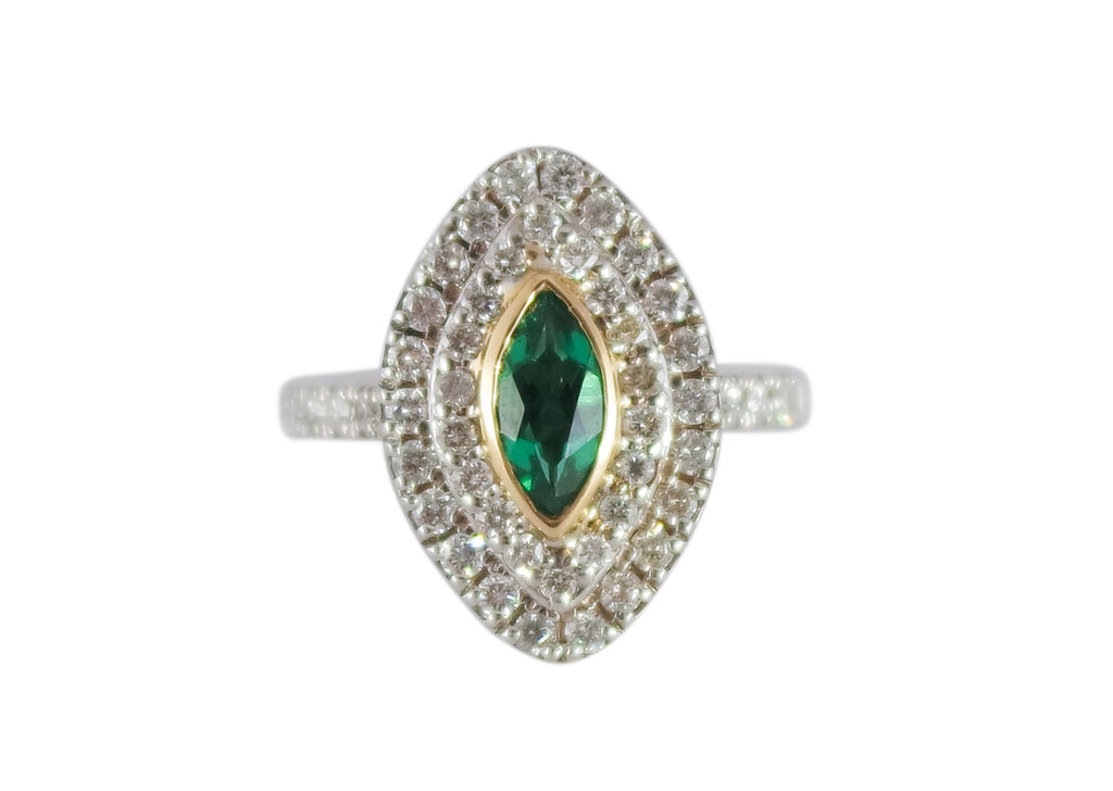 < Back To Birthstone Jewelry Chatham Emerald & Diamond Ring Two tone, 14kt white gold and 18kt yellow gold, Chatham Emerald and diamond ring containing a .50ct marquise cut created Chatham emerald center gemstone with 52 round accent diamonds equaling .77ctw. SKU: CR0011 Default Title - $ 2,575.00 USD Suggested Retail Price: $6,955.11 Klass Jewelers Price! $2,575.00 Add To Shopping Bag Share:
