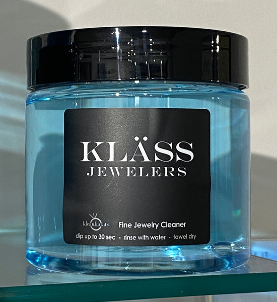 Klass Jewelers fine jewelry cleaner for cleaning jewelry at home. Soak piece up to 30 seconds, rinse with water and towel dry. Not recommended for colored stones. Klass Jewelers recommends getting your jewelry professionally cleaned and checked every 6 months to a year.
