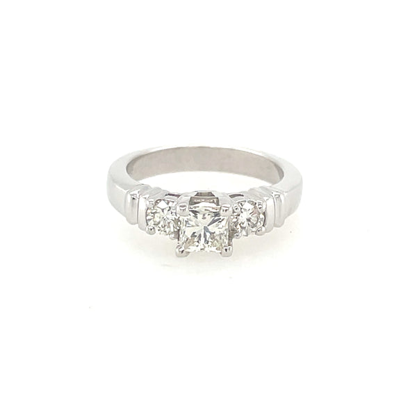 14kt white gold 3 stone style diamond engagement ring containing a princess cut center diamond weighing approximately .70ct, clarity grade approximately SI2, color grade approximately G-H, also containing 2 round brilliant side diamonds having a combined total weight of approximately .30ctw, clarity grade approximately SI2, color grade approximately G-H.