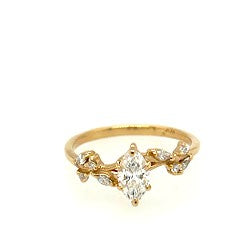 14kt yellow gold diamond engagement ring containing a marquise center diamond weighing approximately .47ct, clarity grade SI1, color grade G, also containing 4 marquise cut side diamonds and 4 round side diamonds having a combined total weight of approximately .18ctw, clarity grade approximately VS2-SI1, color grade approximately G-H.