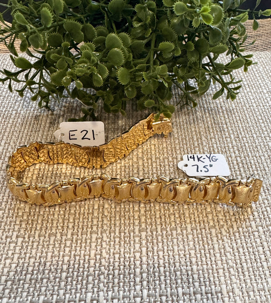 < Back To Estate Jewelry Gold Oval Link Bracelet 14kt yellow gold oval link chain 7.5" bracelet with brushed gold centers. SKU: E21 Default Title - $ 0.01 USD Contact Us for Price 859-525-7500 Contact Us Share: