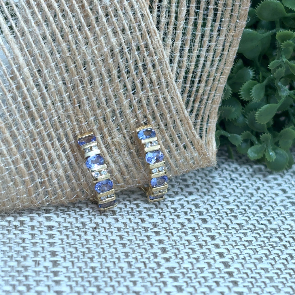< Back To Estate Jewelry Yellow Gold Tanzanite Diamond Earrings 14kt yellow gold hoop earrings with 4 oval tanzanite stones each and 6 round diamonds in each. SKU: E259 Default Title - $ 0.01 USD Contact Us for Price 859-525-7500 Contact Us Share: