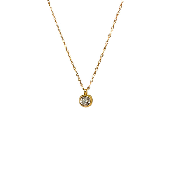 < Back To Fashionista Faceted Bezel Set Diamond Pendant Necklace 14kt white and yellow gold faceted bezel set pendant containing 1 round diamond, total approximately .04ctw clarity SI1, color G-H on an 18in yellow gold cable chain. SKU: DP0259 Default Title - $ 510.00 USD Suggested Retail Price: $1,380.02 Klass Jewelers Price! $510.00 Add To Shopping Bag Share: