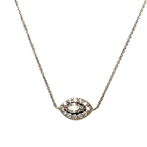 < Back To Fashionista Marquise Diamond with Halo Pendant Necklace 14kt white gold pendant containing a marquise diamond center stone, clarity approximately VS2, color I, with 12 surrounding round diamonds in the halo total approximately .40ctw on an 18in white gold chain. SKU: DP0261 Default Title - $ 975.00 USD Suggested Retail Price: $3,505.06 Klass Jewelers Price! $975.00 Add To Shopping Bag Share: