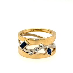 14kt two toned white and yellow gold negative space ring containing a genuine blue sapphire approximately 5mm x 2.5mm baguette and a genuine marquise blue sapphire approximately 5mm x 2.5mm with three diamonds total approximately .09ctw, quality approximately VS2, color approximately G.