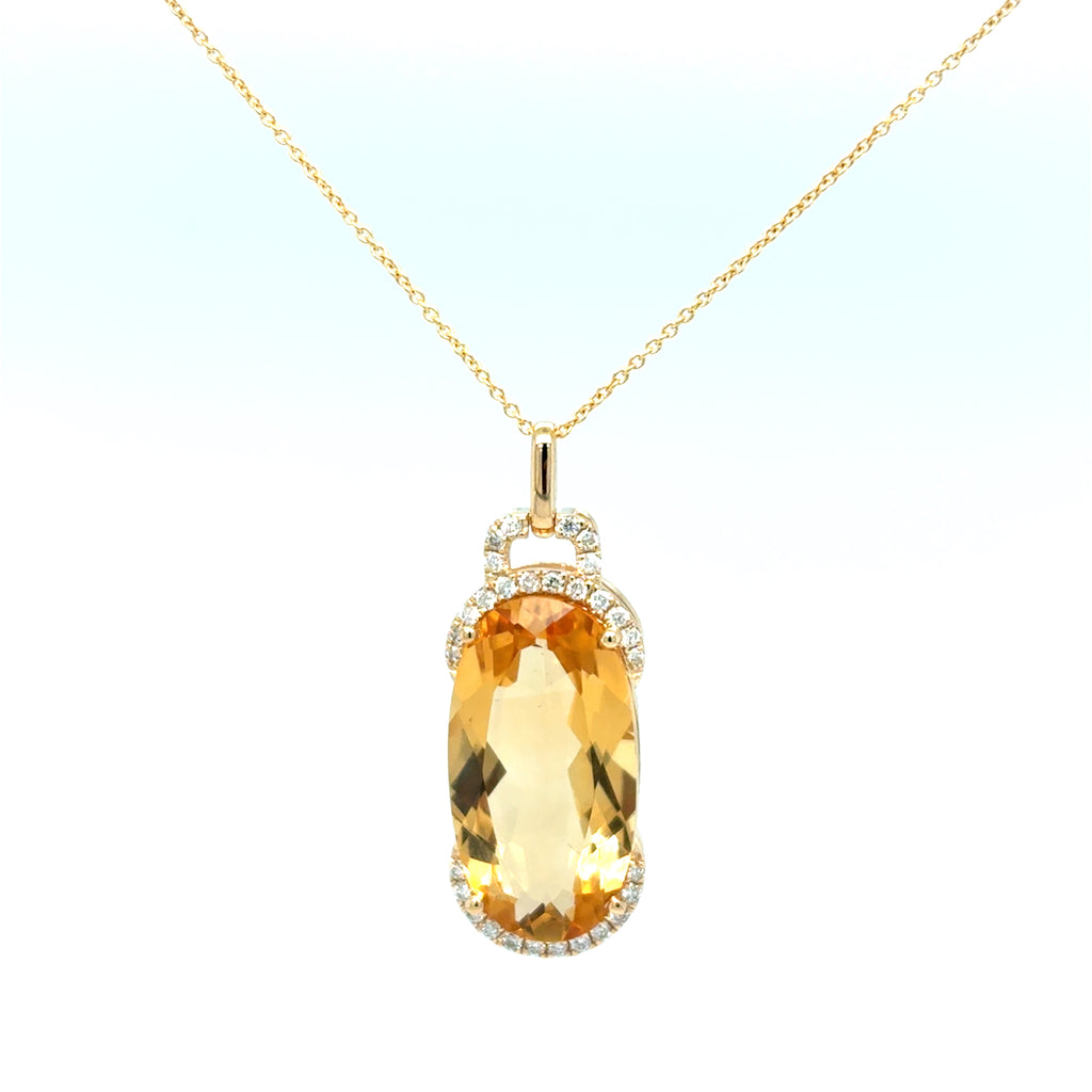 < Back To Gifts Under $1500 Citrine and Diamond Pendant 14kt yellow gold pendant containing one citrine center stone approximately 19mmx10.2mm total 6.87ctw, with surrounding 30 accent diamonds approximately .18ctw, quality SI1, color G. Chain sold separately. SKU: CP0170 Default Title - $ 1,385.00 USD Suggested Retail Price: $3,741.05 Klass Jewelers Price! $1,385.00 Add To Shopping Bag Share: