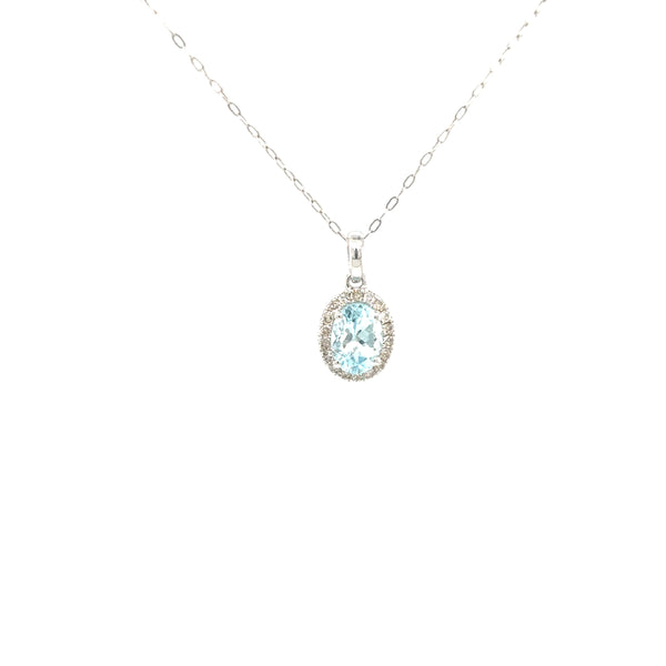 14kt white gold aquamarine and diamond pendant containing an oval aquamarine center gemstone approximately 7x5mm, approximately .79ct, also containing 18 round single cut diamonds having a combined total weight of approximately .14ctw, clarity grade approximately SI1, color grade approximately G, chain sold separately.