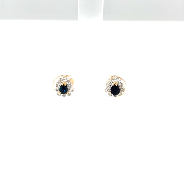 14kt yellow gold blue sapphire and diamond earrings containing two 4x3mm pear shaped genuine glue sapphire gemstones with 20 round accent diamonds having a combined total weight of approximately .12ctw, clarity grade approximately SI2, color grade approximately G-H.