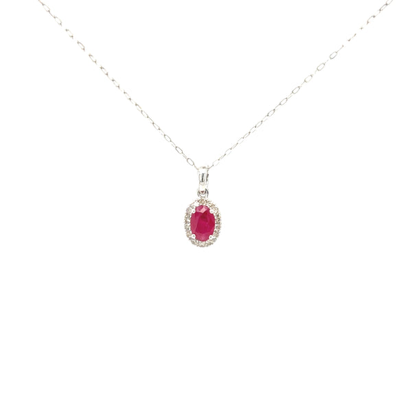 14kt white gold ruby and diamond pendant containing an oval ruby center gemstone approximately 6x4mm, approximately .46ct, also containing 14 round single cut diamonds having a combined total weight of approximately .10ctw, clarity grade approximately SI1, color grade approximately G-H, chain sold separately.