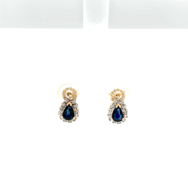 14kt yellow gold blue sapphire and diamond earrings containing two 6x4mm pear shaped genuine glue sapphire gemstones with 26 round accent diamonds having a combined total weight of approximately .28ctw, clarity grade approximately SI2, color grade approximately G-H.
