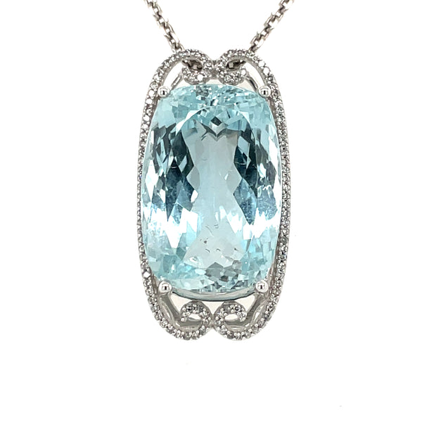 14kt white gold blue topaz and diamond pendant containing an approximately 22x15mm antique cushion cut blue topaz center gemstone weighing approximately 33.61ct, also containing 104 round diamonds having a combined total weight of approximately .32ctw, clarity grade approximately SI1, color grade approximately G-H, on an 18in 14kt white gold chain.