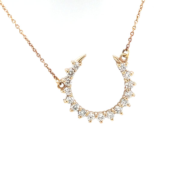 14kt yellow gold diamond horseshoe shaped necklace containing 16 round diamonds having a combined total weight of approximately .48ctw, clarity grade approximately VS2, color grade approximately G-H, attached to a 14kt yellow gold chain, approximately 17in in overall length.