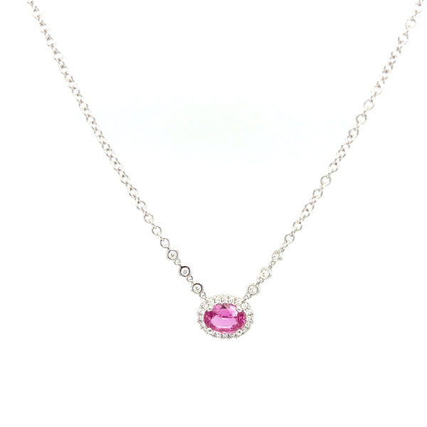 18kt white gold pendant containing a single oval shaped pink sapphire approximately .69ctw, with surrounding halo of 20 round diamonds and 6 accent diamonds on the chain total approximately .12ctw, clarity approximately VS1, color approximately F-G on an adjustable 16-18in chain.