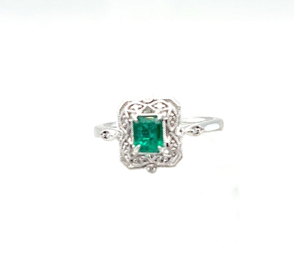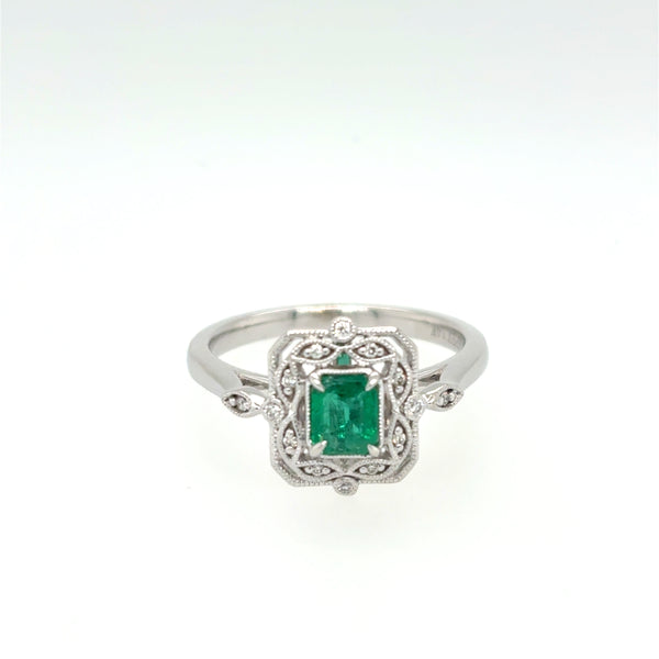 14kt white gold emerald and diamond ring containing a genuine emerald cut emerald center stone weighing approximately .43ct, also containing 14 round diamonds having a combined total weight of approximately .06ctw, clarity grade approximately SI1-SI2, color grade approximately G.