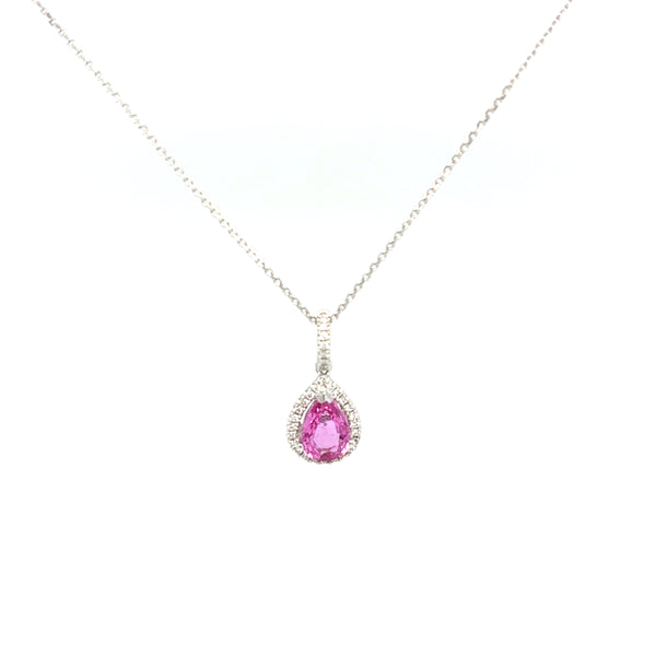 18kt white gold pendant containing a single pear-shaped pink sapphire approximately .85ctw, with surrounding halo of 25 round diamonds and 6 accent diamonds on the bail, diamond total approximately .08ctw, clarity approximately VS1, color approximately F-G.