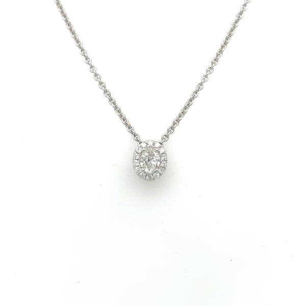 14kt white gold halo style diamond pendant containing an oval center diamond weighing approximately .25ct, with 14 round accent diamonds having a combined total weight of approximately .08ctw, clarity grade on all diamonds approximately VS2, color grade on all diamonds approximately G-H, on an 18in 14kt white gold chain.