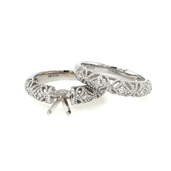 14kt white gold lab grown diamond wedding set, engagement ring contains 4 round lab grown diamonds having a combined total weight of approximately .06ctw, clarity grade approximately VS2, color grade approximately E, wedding ring contains 5 round lab grown diamonds having a combined total weight of approximately .08ctw, clarity grade approximately VS2, color grade approximately E.