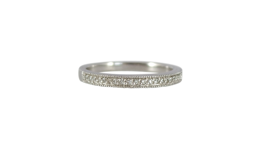 < Back To Wedding Rings Vintage Wedding Ring .19ctw 14kt white gold vintage style diamond wedding ring containing 19 round diamonds equaling .19ctw with milgrain detailing, 1.5DWT. SKU: WR0017 Default Title - $ 869.00 USD Suggested Retail Price: $2,345.00 Klass Jewelers Price! $869.00 Add To Shopping Bag Share: