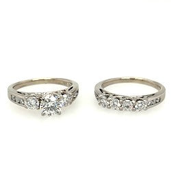 14kt white gold wedding set. Engagement ring containing .75ctw round center stone, two round side accent diamonds .15ct diamonds, and 6 round diamonds channel set in the ring band total .20ctw, all diamonds approximately quality SI2, color approximately H. Wedding band contains 4 round diamonds .10ct each and 6 channel set diamonds .16tw, all diamonds quality approximately SI1, color approximately H.