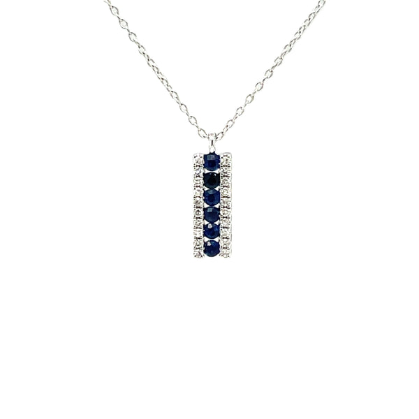 14kt white gold blue sapphire and diamond necklace containing 6 round 1.75mm blue sapphire gemstones also containing 20 round diamonds having a combined total weight of approximately .10ctw, clarity grade approximately VS2, color grade approximately G, on a 14kt white gold 18in chain.