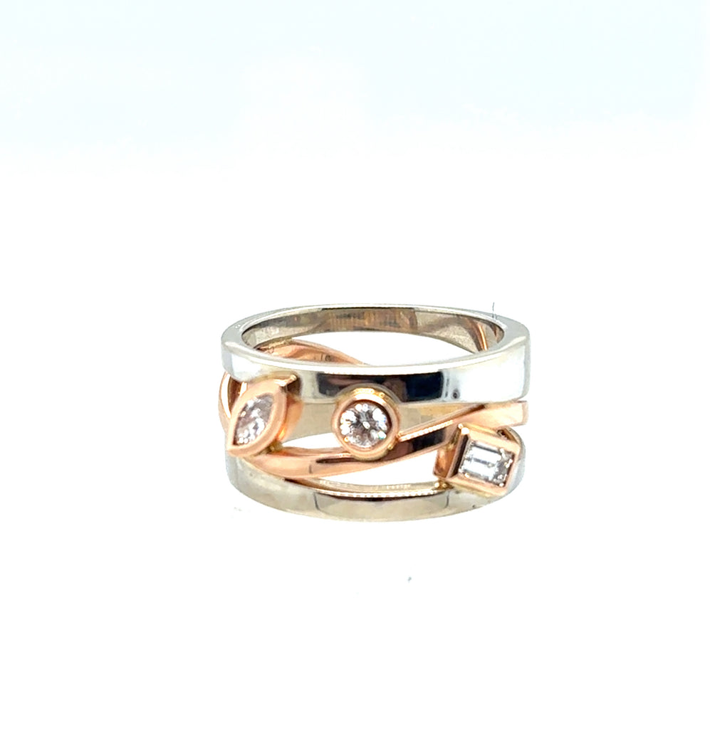 < Back To All Products Diamond Fashion Ring .50ctw 14kt two tone, white and rose, gold diamond fashion ring containing one round bezel set center diamond weighing .10ctw, a bezel set marquise diamond weighing .25ctw, and a bezel set baguette diamond weighing .15ctw. SKU: DR0037 Default Title - $ 2,700.00 USD Suggested Retail Price: $6,765.11 Klass Jewelers Price! $2,700.00 Add To Shopping Bag Share: