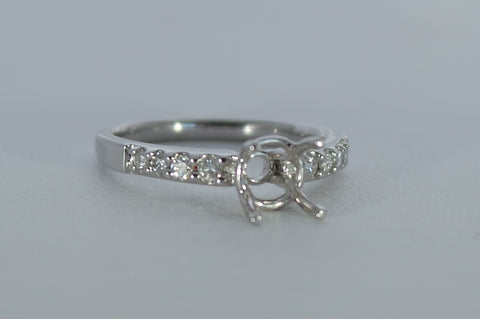14kt white gold wedding set. Engagement ring containing .75ctw round center stone, two round side accent diamonds .15ct diamonds, and 6 round diamonds channel set in the ring band total .20ctw, all diamonds approximately quality SI2, color approximately H. Wedding band contains 4 round diamonds .10ct each and 6 channel set diamonds .16tw, all diamonds quality approximately SI1, color approximately H.
